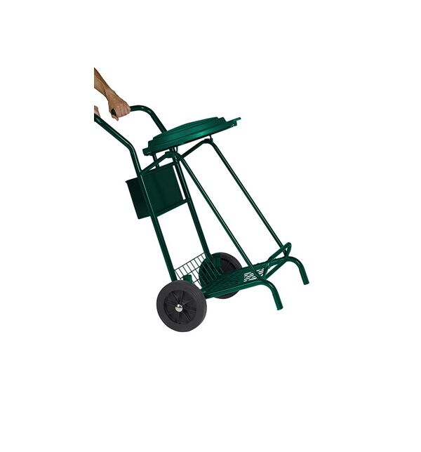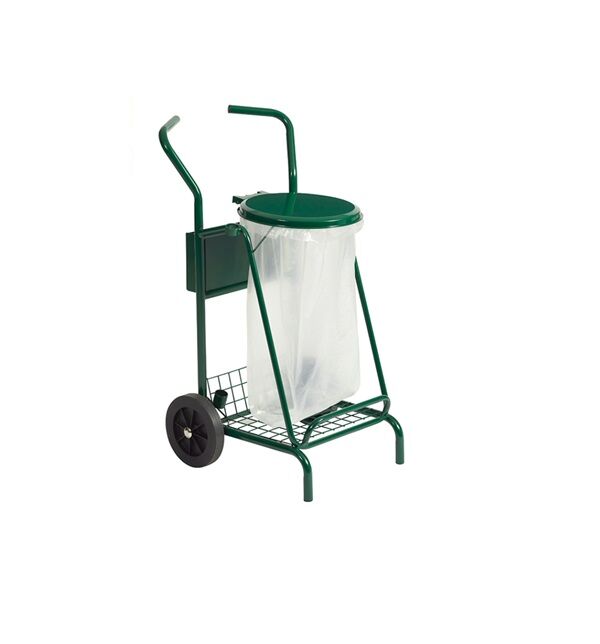 Ce chariot de voirie Rossignol, de fabrication Française, fabriquée par La société Rossignol, en acier poudré, avec maintien du sac avec ceinture élastique, de couleur verte, avec un espace de rangement porte outils très pratique, deux emplacements accessoires pour y installer une pelle et un balai (non fournis) et roues en caoutchouc massif. Ce chariot peut recevoir des sacs poubelles 110 litres.