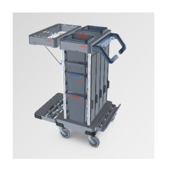 - de nombreux rangements dont un plateau, une boîte de rangement et de deux seaux de 5 litres pour les lavettes et les pulvérisateur de produit.