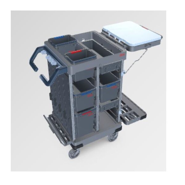 - de nombreux rangements dont deux plateaux, une boîte de rangement et de deux seaux de 5 litres pour les lavettes et les pulvérisateur de produit.