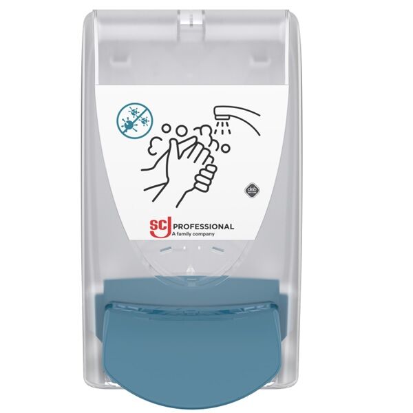 Appareil distributeur sérigraphié lavage antibactérien 1L en plastique ultra résistant, verrouillable avec large bouton poussoir.