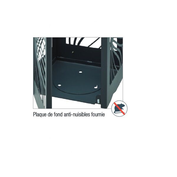 Cette poubelle EXTERIEUR avec cendrier CYBEL Anthracite 110 litres, de fabrication Française, fabriquée par La société Rossignol, en acier poudré anti-UV traité anticorrosion, en structure monobloc avec port en façade. Une porte indégondable avec charnières en aluminium rivetées et double étriers facilitant le retrait du sac. Le modèle proposé comprend la plaque anti-nuisible à installer au fond de la corbeille.