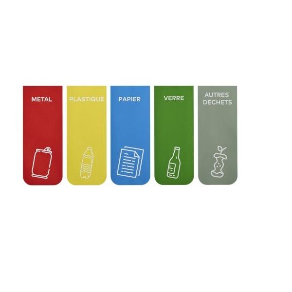 Planche de stickers fournie : pour le métal, le plastique, le papier, le verre, et autres déchets. Cette signalétique se positionne sur le dessus et sur la façade de la poubelle tri sélectif TRIBU. Il s’agit d’un produit fabriqué à partir de matières recyclables.